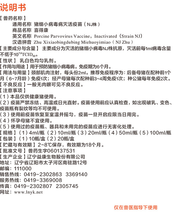 豬細小病毒病滅活疫苗(NJ株)商品名:喜得康